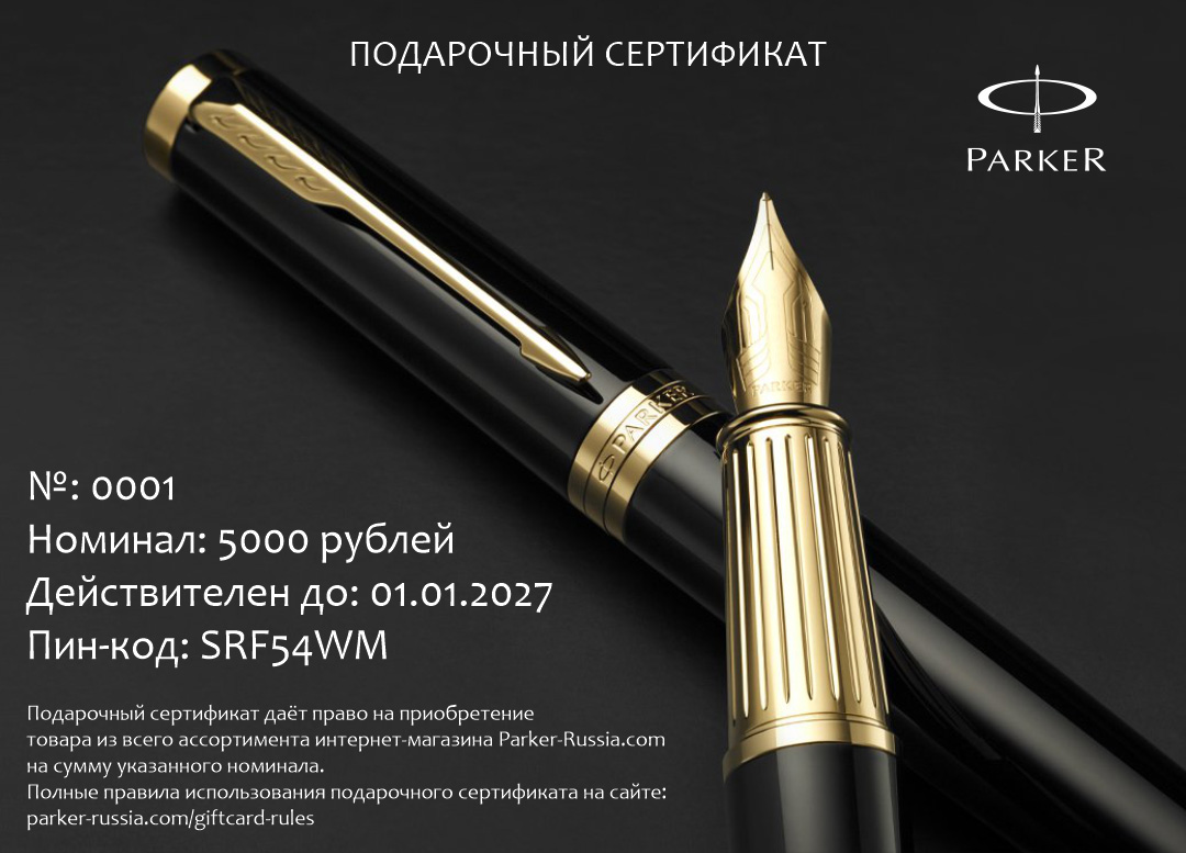 Подарочный сертификат Parker 5000 от официального дилера Parker в Мурманске. Вы можете дополнительно заказать гравировку, которая подчеркнет Вашу оригинальность и придаст памятность статусному подарку. Все ручки Паркер поставляются в фирменном футляре.